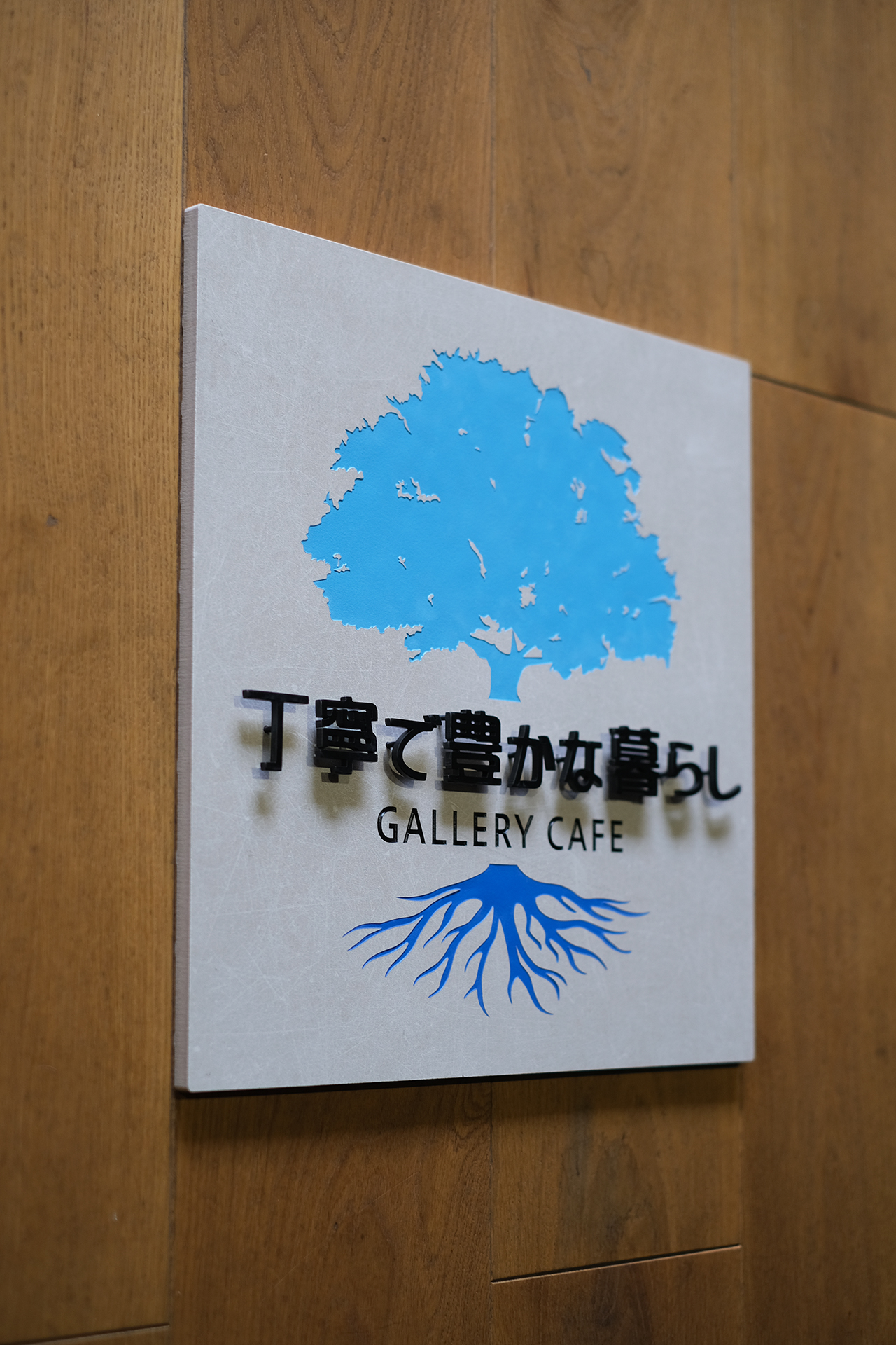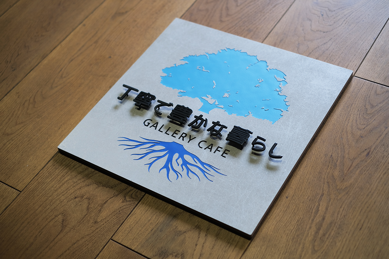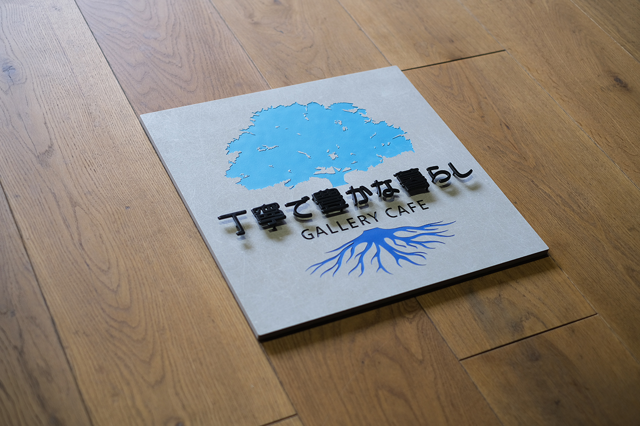 ホワイトタイルにステンレス浮き文字のギャラリーカフェのサイン