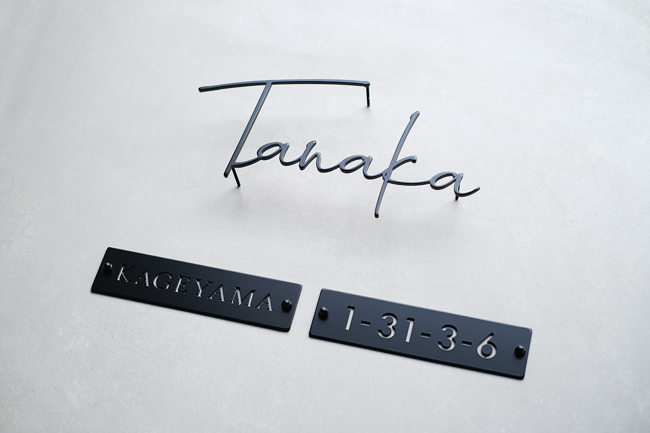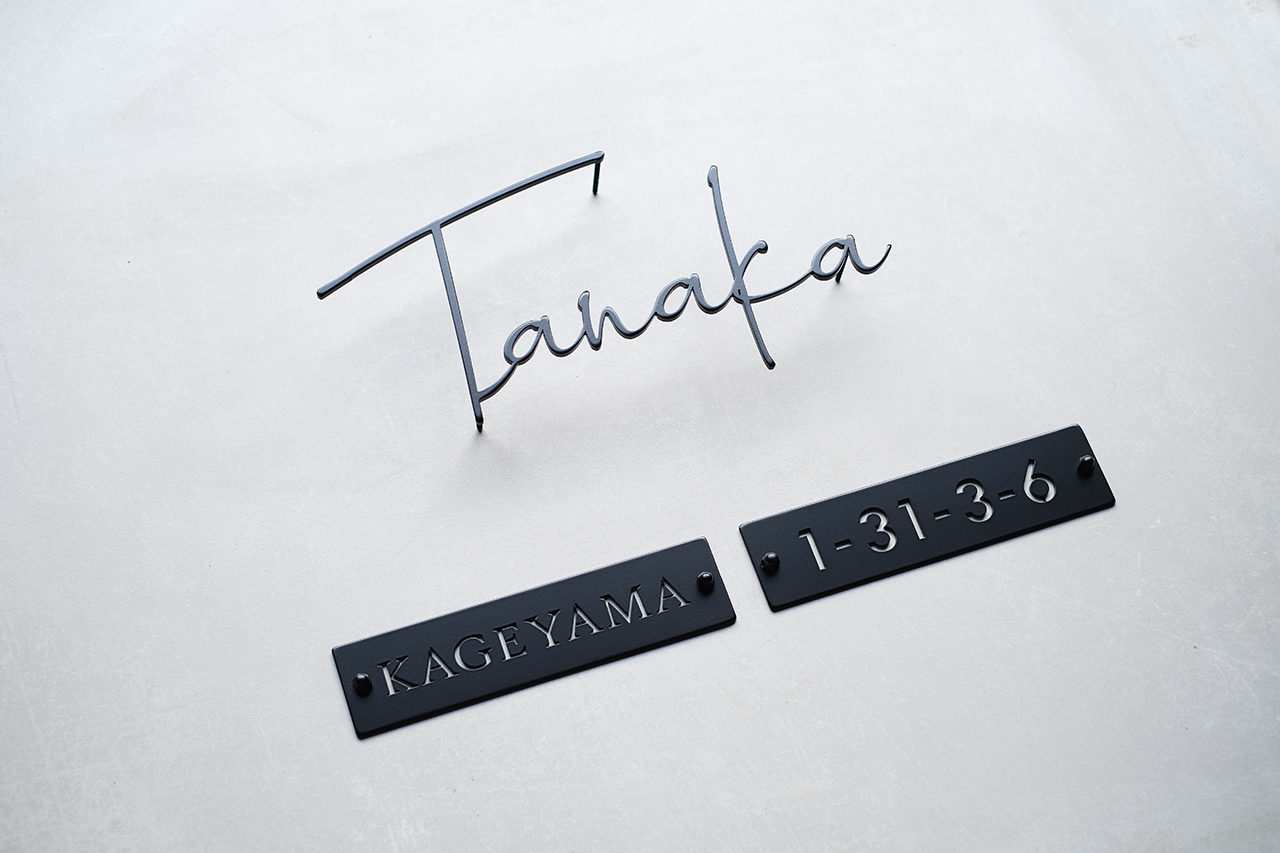 マットブラックのステンレス切り文字表札とハウスナンバー、二世帯表札プレート