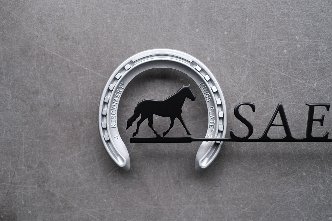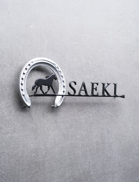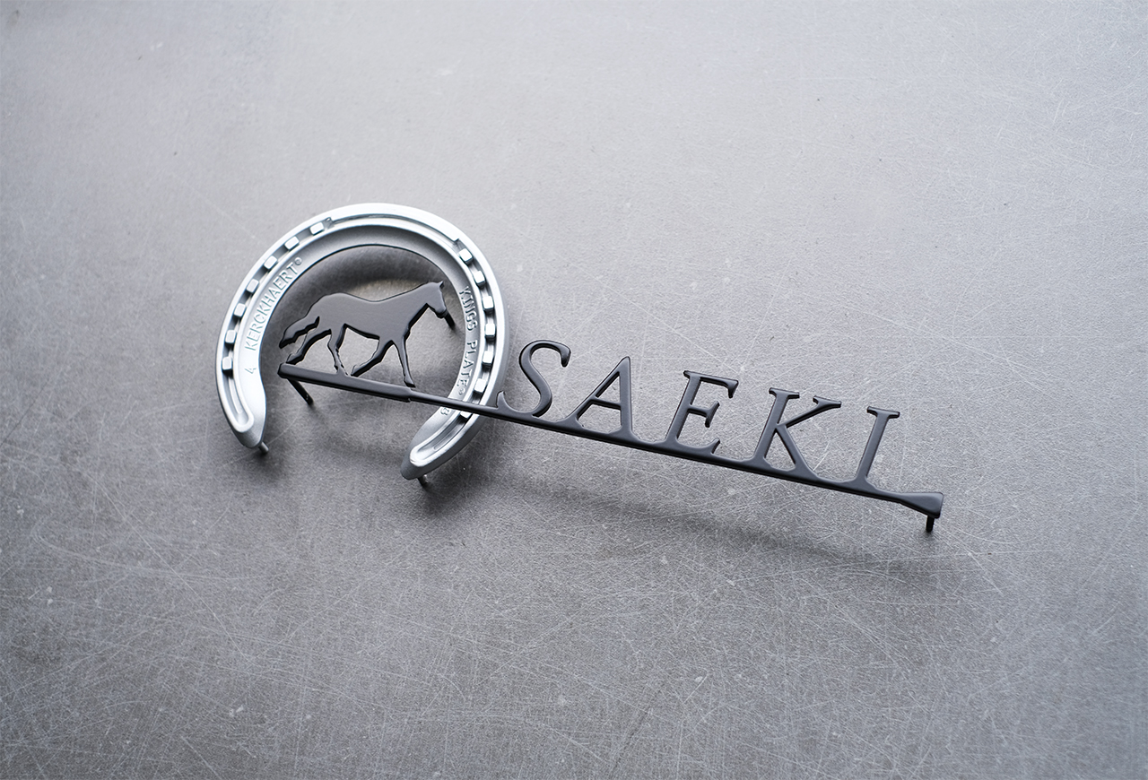 調教用アルミ製の蹄鉄はマットシルバー、表札部はマットブラックの焼付け塗装しました